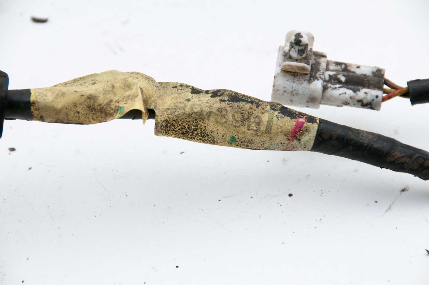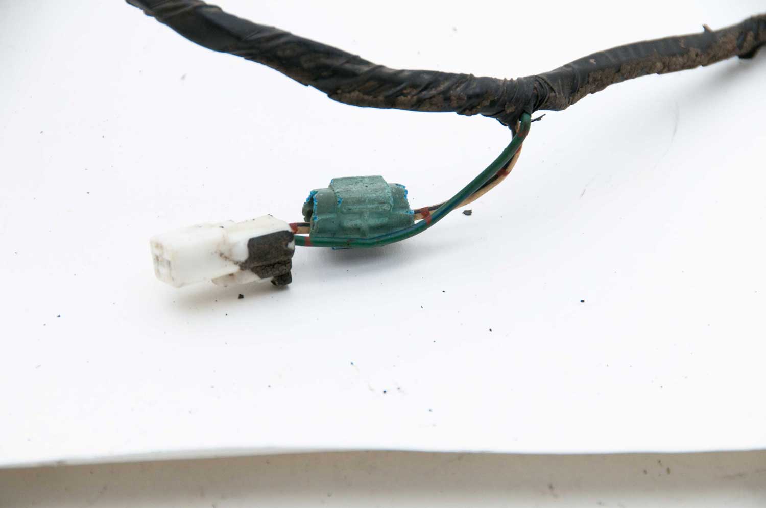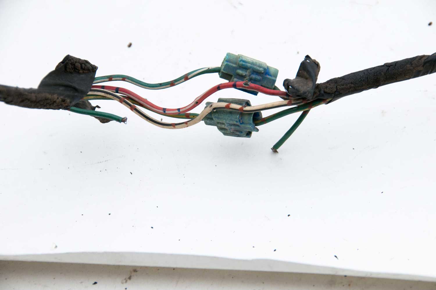 The first location has two scotchlock connectors and a separate green wire that was cut. A red wire is also missing a small piece of the insulation.